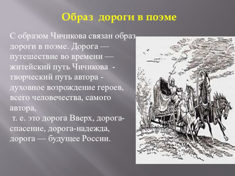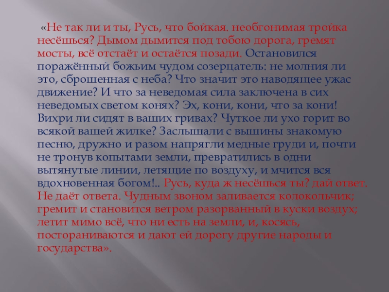 что бойкая. необгонимая тройка несёшься? Дымом дымится под тобою дорога, гремят мосты, всё отстаёт и остаётся позади. Остановился поражённый божьим чудом созерцатель: не молния ли это, сброшенная с неба? Что значит это наводящее ужас движение? И что за неведомая сила заключена в сих неведомых светом конях? Эх, кони, кони, что за кони! Вихри ли сидят в ваших гривах? Чуткое ли ухо горит во всякой вашей жилке? Заслышали с вышины знакомую песню, дружно и разом напрягли медные груди и, почти не тронув копытами земли, превратились в одни вытянутые линии, летящие по воздуху, и мчится вся вдохновенная богом!.. Русь, куда ж несёшься ты? дай ответ. Не даёт ответа. Чудным звоном заливается колокольчик; гремит и становится ветром разорванный в куски воздух; летит мимо всё, что ни есть на земли, и, косясь, постораниваются и дают ей дорогу другие народы и государства».