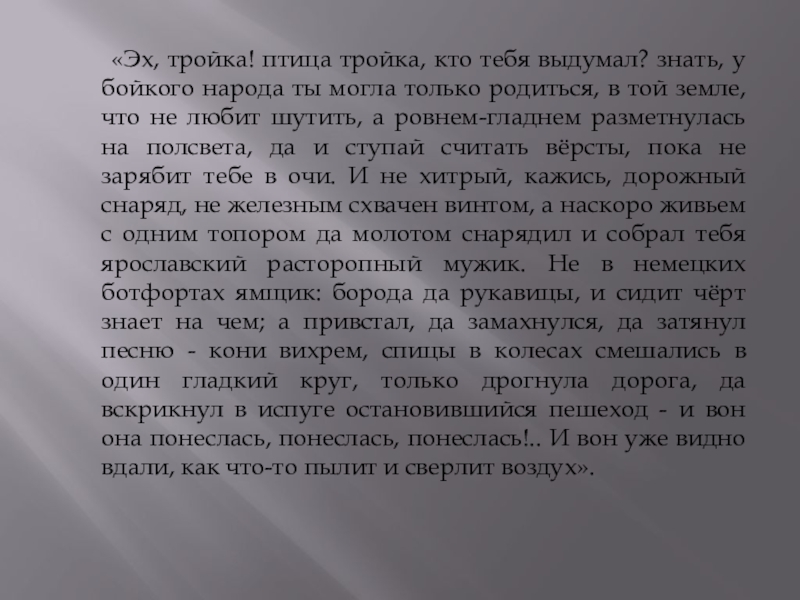 у бойкого народа ты могла только родиться, в той земле, что не любит шутить, а ровнем-гладнем разметнулась на полсвета, да и ступай считать вёрсты, пока не зарябит тебе в очи. И не хитрый, кажись, дорожный снаряд, не железным схвачен винтом, а наскоро живьем с одним топором да молотом снарядил и собрал тебя ярославский расторопный мужик. Не в немецких ботфортах ямщик: борода да рукавицы, и сидит чёрт знает на чем; а привстал, да замахнулся, да затянул песню - кони вихрем, спицы в колесах смешались в один гладкий круг, только дрогнула дорога, да вскрикнул в испуге остановившийся пешеход - и вон она понеслась, понеслась, понеслась!.. И вон уже видно вдали, как что-то пылит и сверлит воздух».