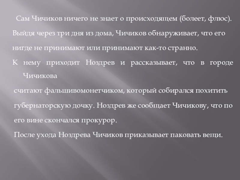 Сам Чичиков ничего не знает о происходящем (болеет, флюс).