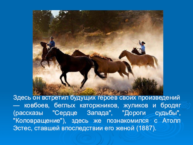 жуликов и бродяг (рассказы "Сердце Запада", "Дороги судьбы", "Коловращение"), здесь же познакомился с Атолл Эстес, ставшей впоследствии его женой (1887).