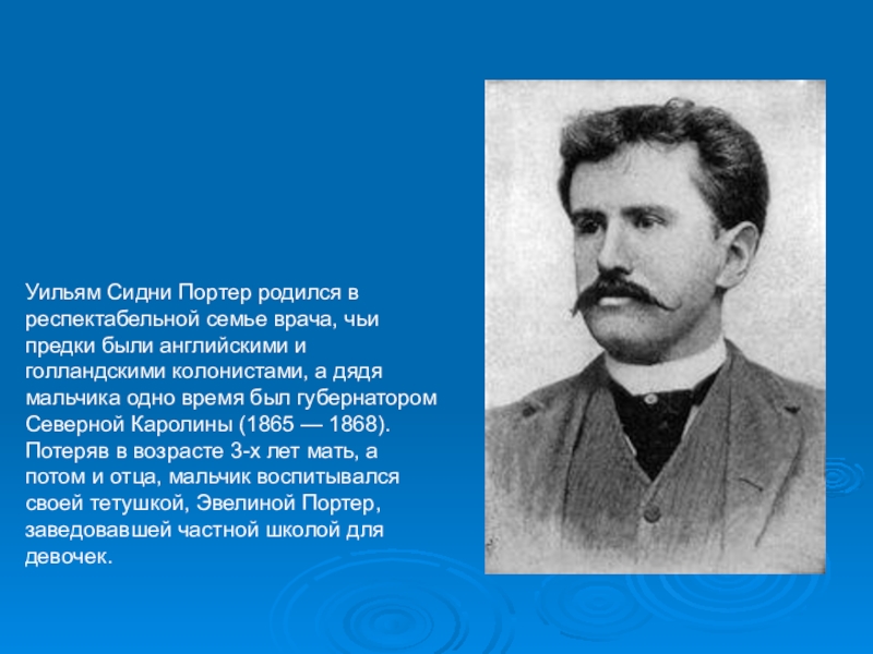 Слайд 2Уильям Сидни Портер родился в респектабельной семье врача, чьи предки были