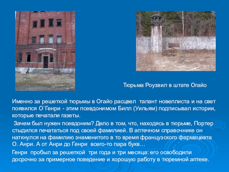 Именно за решеткой тюрьмы в Огайо расцвел талант новеллиста и на свет появился О`Генри - этим псевдонимом Билл (Уильям) подписывал истории, которые печатали газеты.