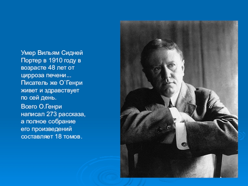 Слайд 16Умер Вильям Сидней Портер в 1910 году в возрасте 48 лет