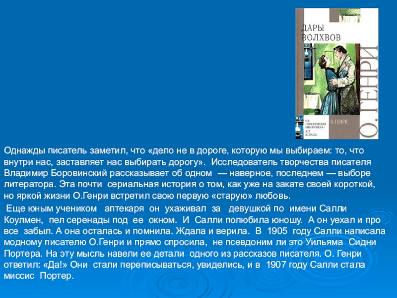 то, что внутри нас, заставляет нас выбирать дорогу». Исследователь творчества писателя Владимир Боровинский рассказывает об одном — наверное, последнем — выборе литератора. Эта почти сериальная история о том, как уже на закате своей короткой, но яркой жизни О.Генри встретил свою первую «старую» любовь.