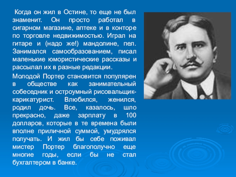 Он просто работал в сигарном магазине, аптеке и в конторе по торговле недвижимостью. Играл на гитаре и (надо же!) мандолине, пел. Занимался самообразованием, писал маленькие юмористические рассказы и рассылал их в разные редакции.