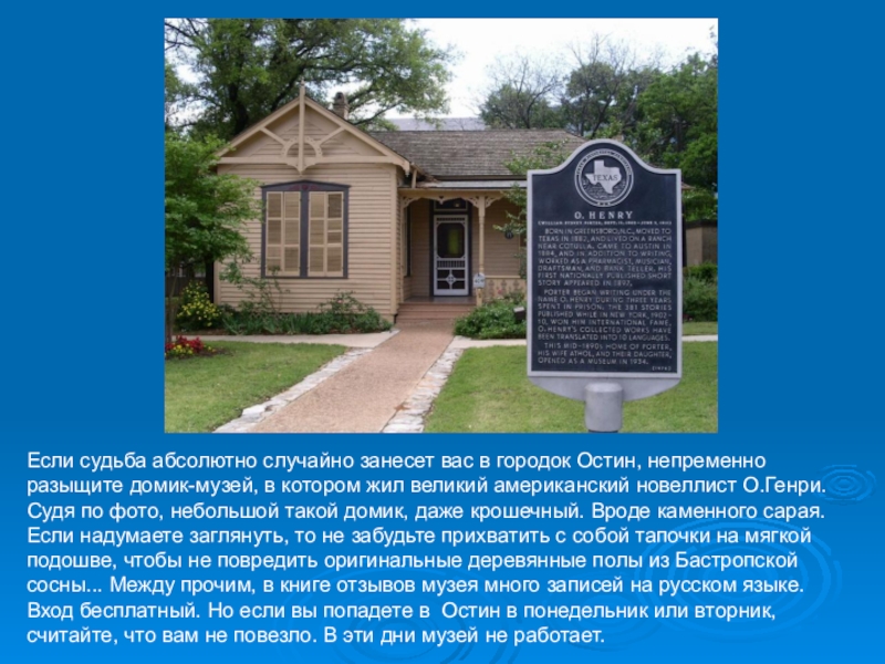 домик-музей, в котором жил великий американский новеллист О.Генри. Судя по фото, небольшой такой домик, даже крошечный. Вроде каменного сарая. Если надумаете заглянуть, то не забудьте прихватить с собой тапочки на мягкой подошве, чтобы не повредить оригинальные деревянные полы из Бастропской сосны... Между прочим, в книге отзывов музея много записей на русском языке. Вход бесплатный. Но если вы попадете в Остин в понедельник или вторник, считайте, что вам не повезло. В эти дни музей не работает.