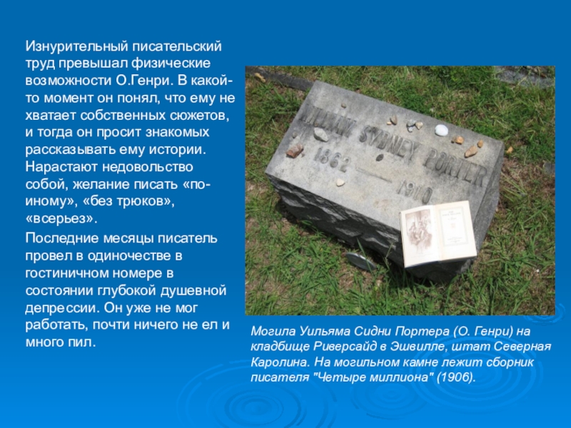 Могила Уильяма Сидни Портера (О. Генри) на кладбище Риверсайд в Эшвилле, штат Северная Каролина. На могильном камне лежит сборник писателя "Четыре миллиона" (1906).