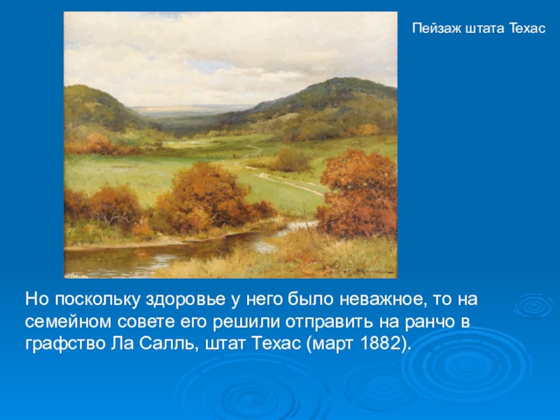 его решили отправить на ранчо в графство Ла Cалль, штат Техас (март 1882).