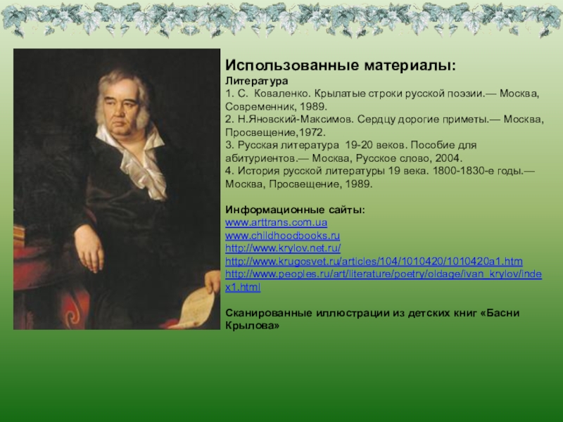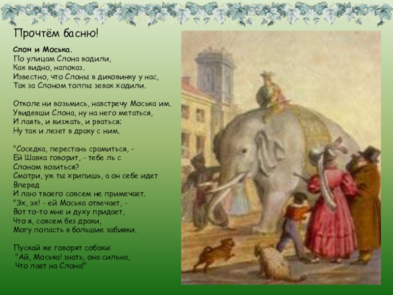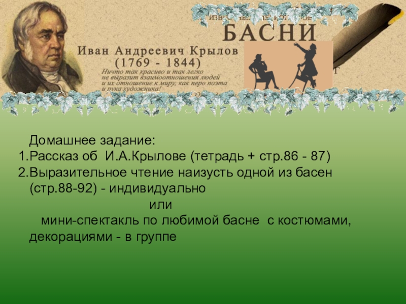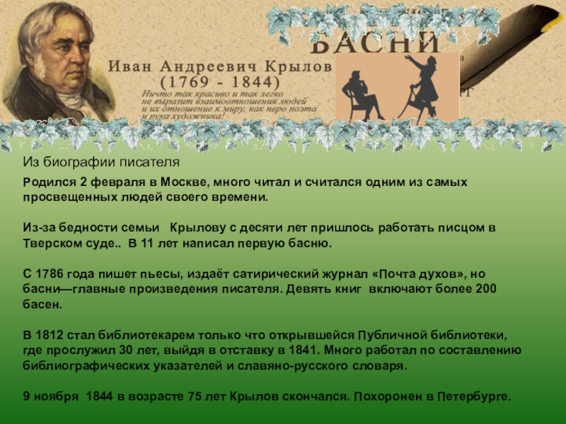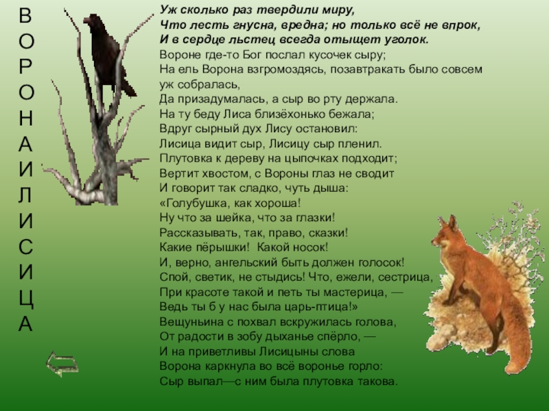 Например, И.А.Крылов через историю Вороны и Лисицы говорит о том, что нельзя верить всему, что тебе говорят.