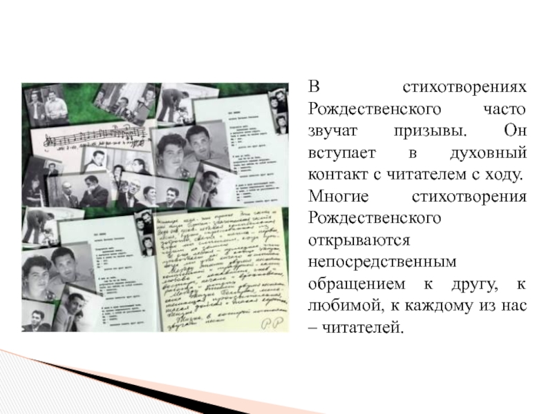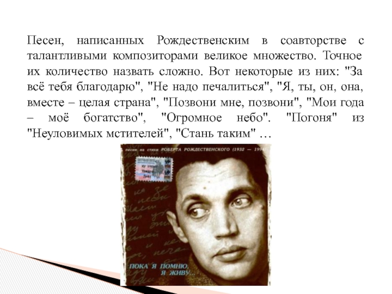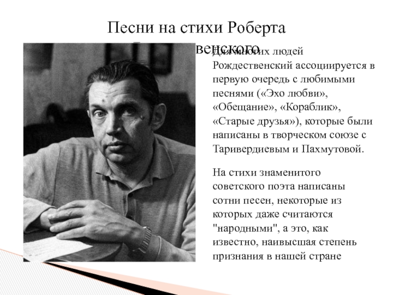 Для многих людей Рождественский ассоциируется в первую очередь с любимыми песнями («Эхо любви», «Обещание», «Кораблик», «Старые друзья»), которые были написаны в творческом союзе с Таривердиевым и Пахмутовой.