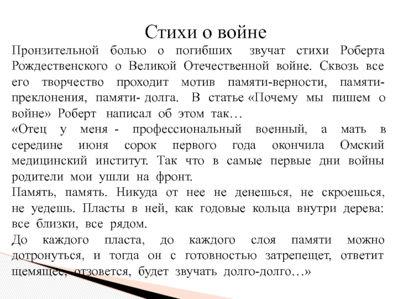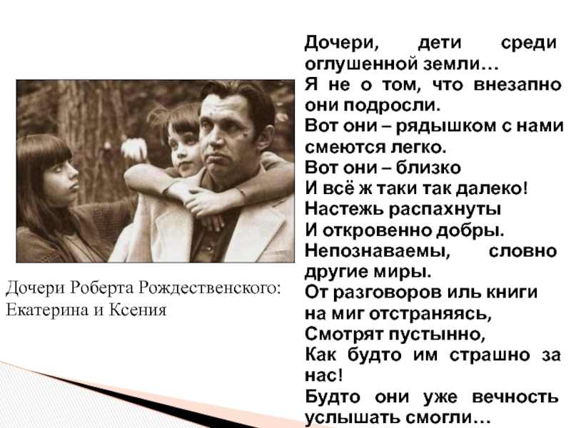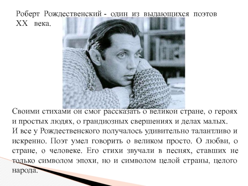 И все у Рождественского получалось удивительно талантливо и искренно. Поэт умел говорить о великом просто. О любви, о стране, о человеке. Его стихи звучали в песнях, ставших не только символом эпохи, но и символом целой страны, целого народа.