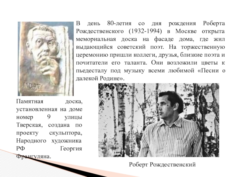 В день 80-летия со дня рождения Роберта Рождественского (1932-1994) в Москве открыта мемориальная доска на фасаде дома, где жил выдающийся советский поэт. На торжественную церемонию пришли коллеги, друзья, близкие поэта и почитатели его таланта. Они возложили цветы к пьедесталу под музыку всеми любимой «Песни о далекой Родине».