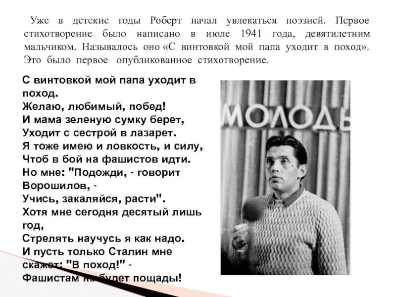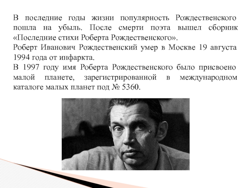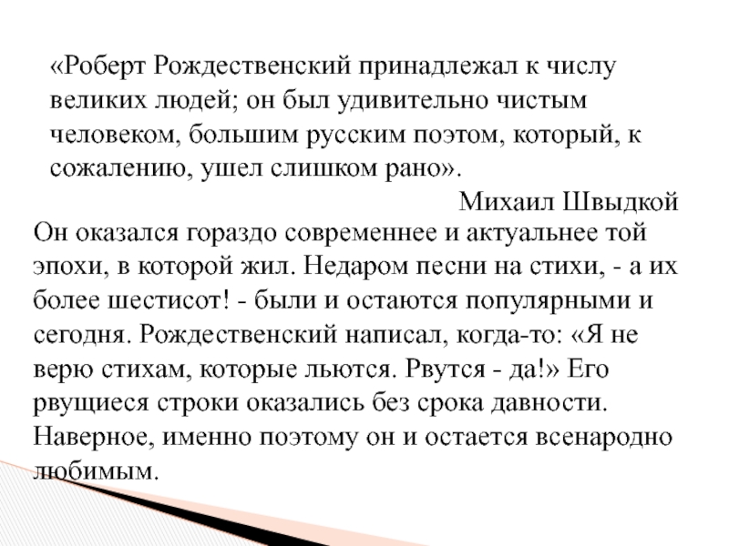 «Роберт Рождественский принадлежал к числу великих людей; он был удивительно чистым человеком, большим русским поэтом, который, к сожалению, ушел слишком рано».
