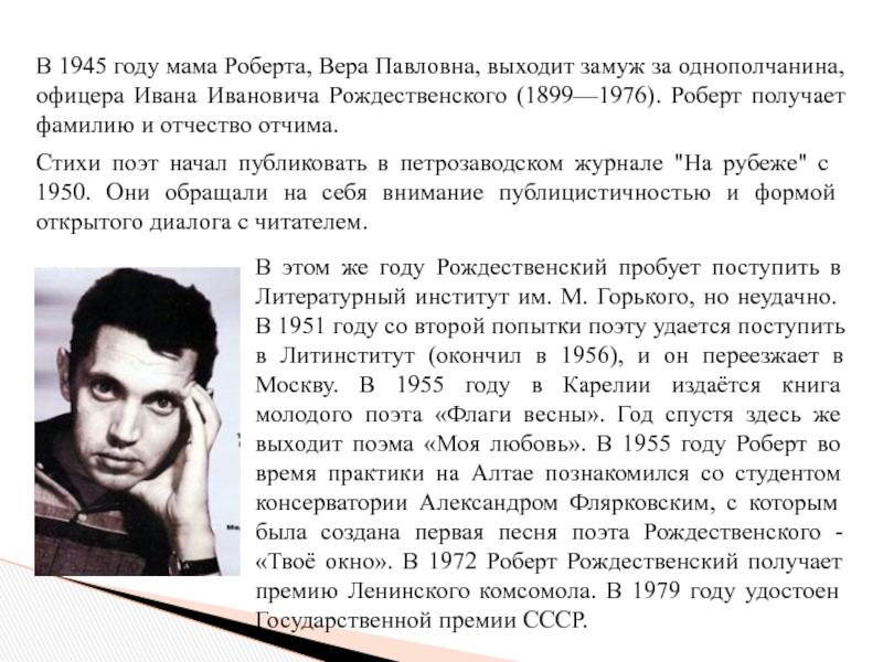 В этом же году Рождественский пробует поступить в Литературный институт им. М. Горького, но неудачно. В 1951 году со второй попытки поэту удается поступить в Литинститут (окончил в 1956), и он переезжает в Москву. В 1955 году в Карелии издаётся книга молодого поэта «Флаги весны». Год спустя здесь же выходит поэма «Моя любовь». В 1955 году Роберт во время практики на Алтае познакомился со студентом консерватории Александром Флярковским, с которым была создана первая песня поэта Рождественского -«Твоё окно». В 1972 Роберт Рождественский получает премию Ленинского комсомола. В 1979 году удостоен Государственной премии СССР.