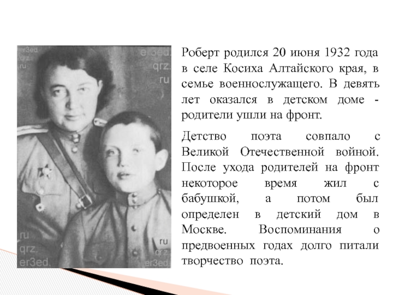 Роберт родился 20 июня 1932 года в селе Косиха Алтайского края, в семье военнослужащего. В девять лет оказался в детском доме - родители ушли на фронт.