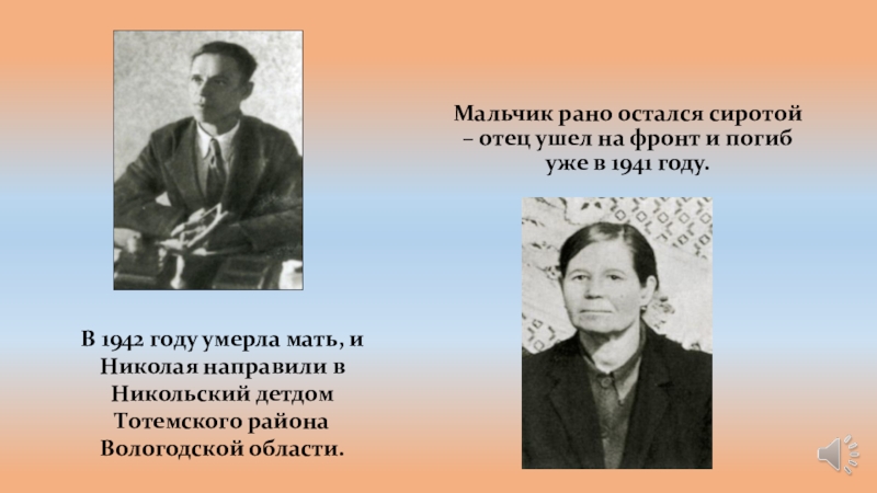 В 1942 году умерла мать, и Николая направили в Никольский детдом Тотемского района Вологодской области.