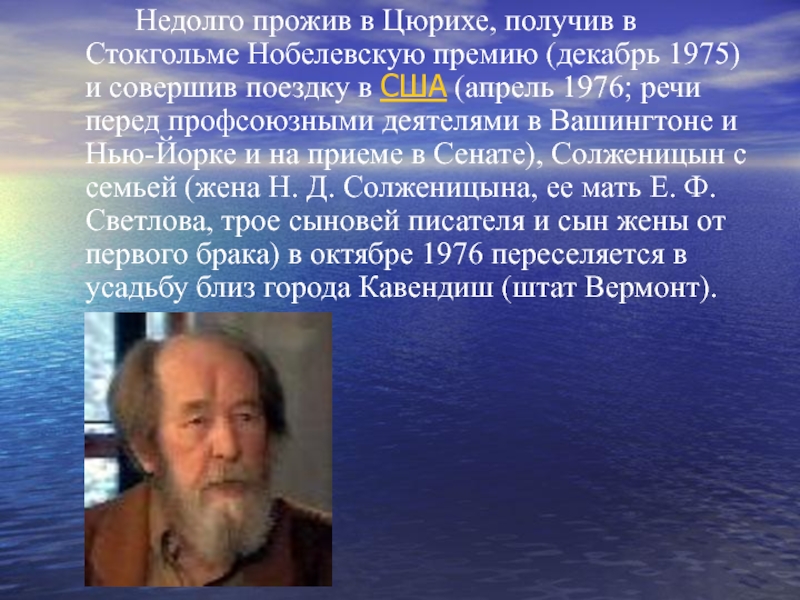 и совершив поездку в США (апрель 1976; речи перед профсоюзными деятелями в Вашингтоне и Нью-Йорке и на приеме в Сенате), Солженицын с семьей (жена Н. Д. Солженицына, ее мать Е. Ф. Светлова, трое сыновей писателя и сын жены от первого брака) в октябре 1976 переселяется в усадьбу близ города Кавендиш (штат Вермонт).