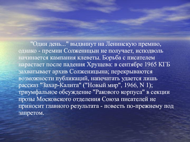 получает, исподволь начинается кампания клеветы. Борьба с писателем нарастает после падения Хрущева: в сентябре 1965 КГБ захватывает архив Солженицына; перекрываются возможности публикаций, напечатать удается лишь рассказ "Захар-Калита" ("Новый мир", 1966, N 1); триумфальное обсуждение "Ракового корпуса" в секции прозы Московского отделения Союза писателей не приносит главного результата - повесть по-прежнему под запретом.