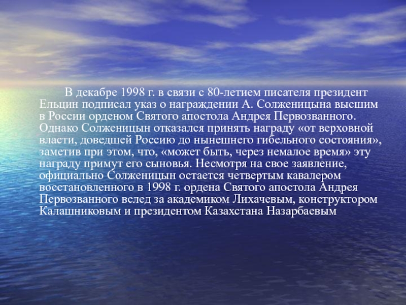 подписал указ о награждении А. Солженицына высшим в России орденом Святого апостола Андрея Первозванного. Однако Солженицын отказался принять награду «от верховной власти, доведшей Россию до нынешнего гибельного состояния», заметив при этом, что, «может быть, через немалое время» эту награду примут его сыновья. Несмотря на свое заявление, официально Солженицын остается четвертым кавалером восстановленного в 1998 г. ордена Святого апостола Андрея Первозванного вслед за академиком Лихачевым, конструктором Калашниковым и президентом Казахстана Назарбаевым