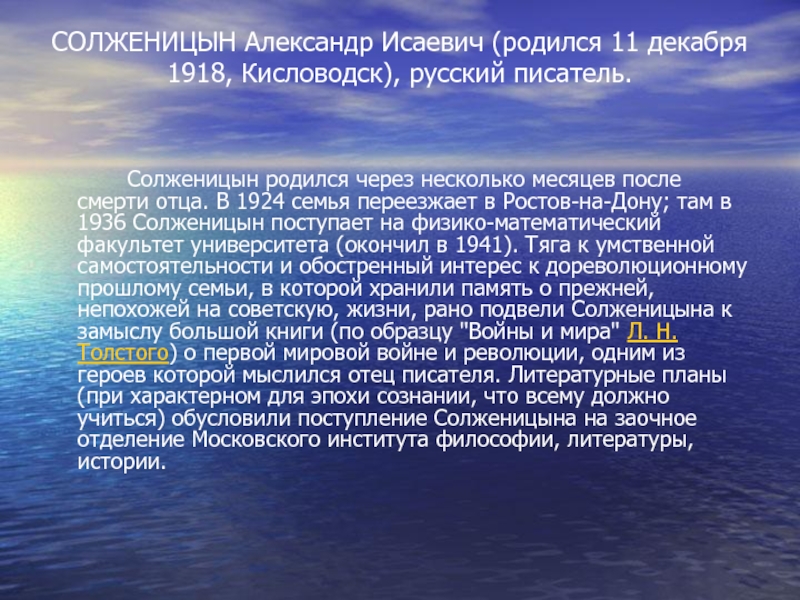 Слайд 2СОЛЖЕНИЦЫН Александр Исаевич (родился 11 декабря 1918, Кисловодск), русский писатель.