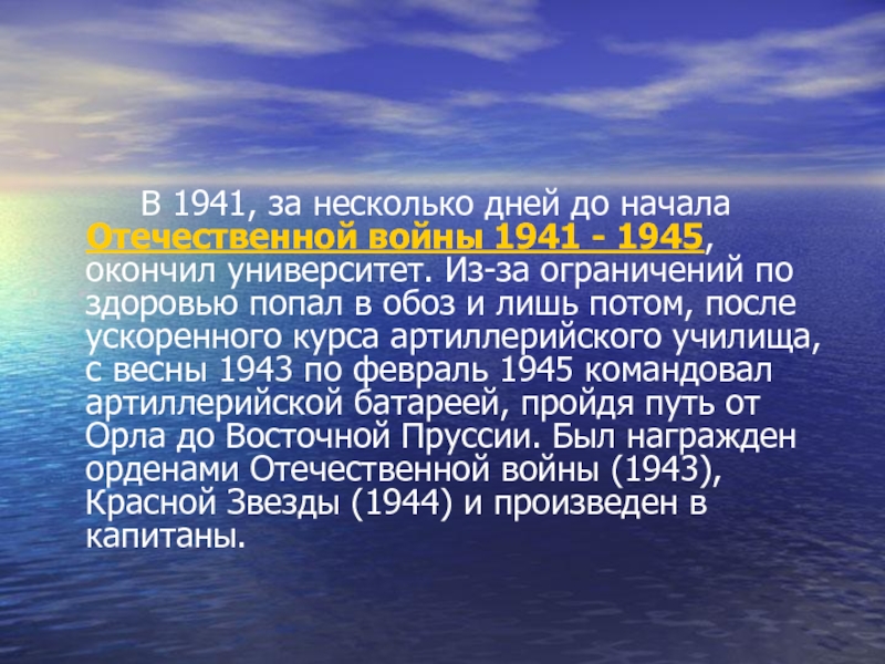 1945, окончил университет. Из-за ограничений по здоровью попал в обоз и лишь потом, после ускоренного курса артиллерийского училища, с весны 1943 по февраль 1945 командовал артиллерийской батареей, пройдя путь от Орла до Восточной Пруссии. Был награжден орденами Отечественной войны (1943), Красной Звезды (1944) и произведен в капитаны.