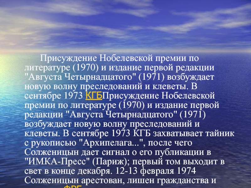 Четырнадцатого" (1971) возбуждает новую волну преследований и клеветы. В сентябре 1973 КГБПрисуждение Нобелевской премии по литературе (1970) и издание первой редакции "Августа Четырнадцатого" (1971) возбуждает новую волну преследований и клеветы. В сентябре 1973 КГБ захватывает тайник с рукописью "Архипелага...", после чего Солженицын дает сигнал о его публикации в "ИМКА-Пресс" (Париж); первый том выходит в свет в конце декабря. 12-13 февраля 1974 Солженицын арестован, лишен гражданства и выслан в ФРГ.