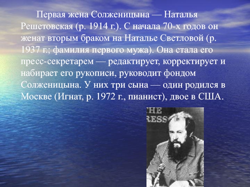Слайд 11 Первая жена Солженицына — Наталья Решетовская (р. 1914 г.). С начала