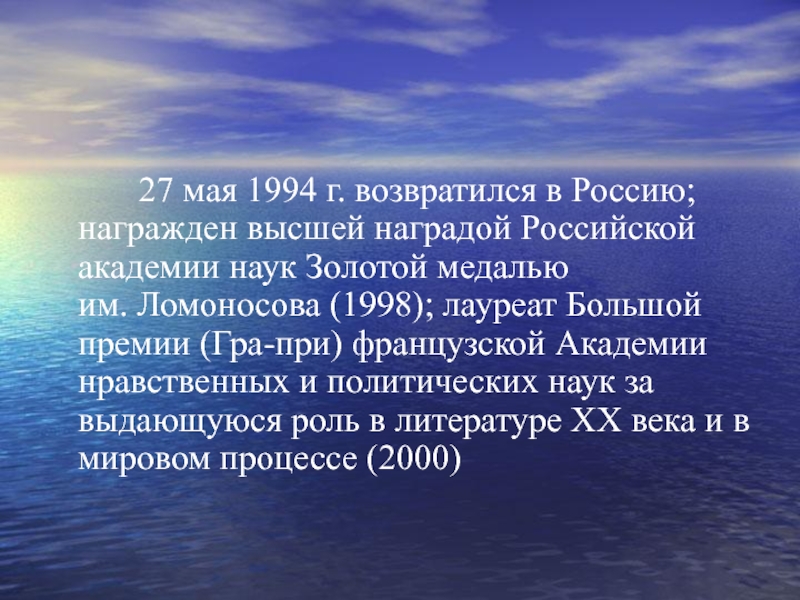 Российской академии наук Золотой медалью им. Ломоносова (1998); лауреат Большой премии (Гра-при) французской Академии нравственных и политических наук за выдающуюся роль в литературе XX века и в мировом процессе (2000)