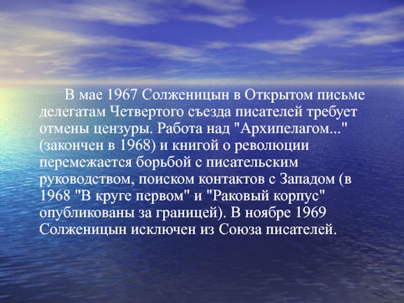требует отмены цензуры. Работа над "Архипелагом..." (закончен в 1968) и книгой о революции перемежается борьбой с писательским руководством, поиском контактов с Западом (в 1968 "В круге первом" и "Раковый корпус" опубликованы за границей). В ноябре 1969 Солженицын исключен из Союза писателей.