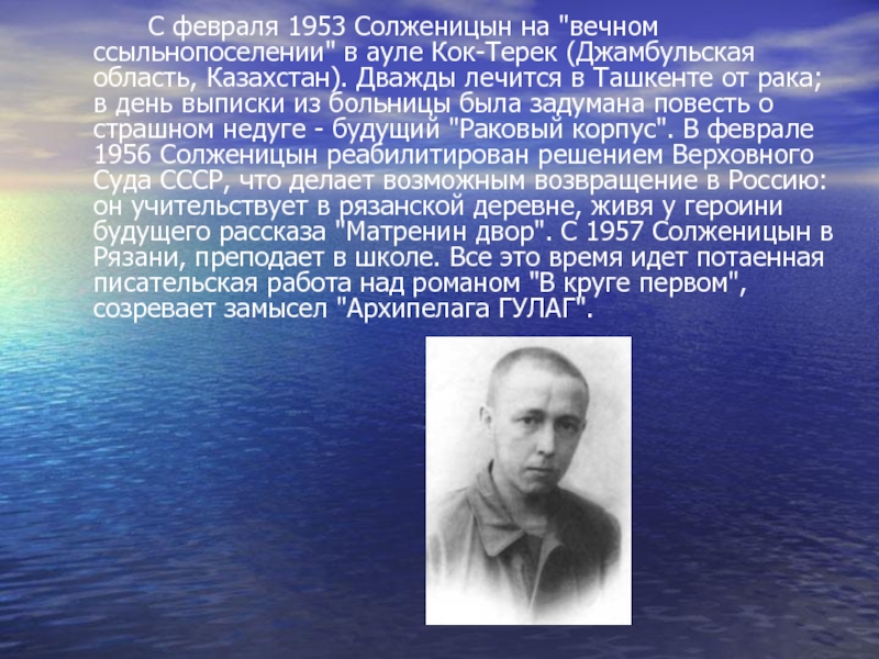 область, Казахстан). Дважды лечится в Ташкенте от рака; в день выписки из больницы была задумана повесть о страшном недуге - будущий "Раковый корпус". В феврале 1956 Солженицын реабилитирован решением Верховного Суда СССР, что делает возможным возвращение в Россию: он учительствует в рязанской деревне, живя у героини будущего рассказа "Матренин двор". С 1957 Солженицын в Рязани, преподает в школе. Все это время идет потаенная писательская работа над романом "В круге первом", созревает замысел "Архипелага ГУЛАГ".