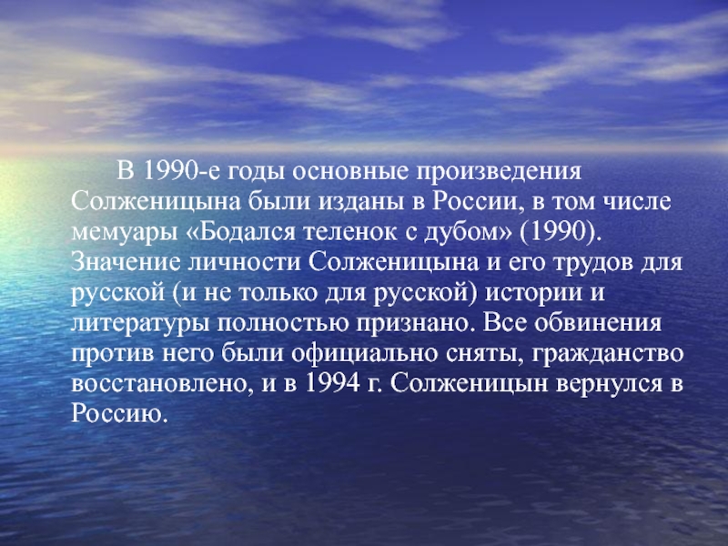 том числе мемуары «Бодался теленок с дубом» (1990). Значение личности Солженицына и его трудов для русской (и не только для русской) истории и литературы полностью признано. Все обвинения против него были официально сняты, гражданство восстановлено, и в 1994 г. Солженицын вернулся в Россию.