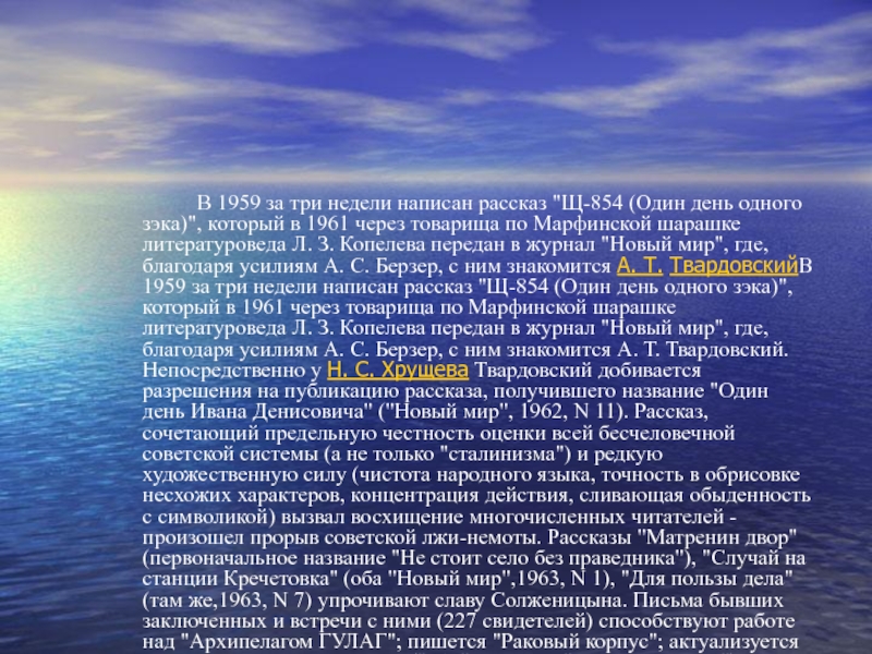 зэка)", который в 1961 через товарища по Марфинской шарашке литературоведа Л. З. Копелева передан в журнал "Новый мир", где, благодаря усилиям А. С. Берзер, с ним знакомится А. Т. ТвардовскийВ 1959 за три недели написан рассказ "Щ-854 (Один день одного зэка)", который в 1961 через товарища по Марфинской шарашке литературоведа Л. З. Копелева передан в журнал "Новый мир", где, благодаря усилиям А. С. Берзер, с ним знакомится А. Т. Твардовский. Непосредственно у Н. С. Хрущева Твардовский добивается разрешения на публикацию рассказа, получившего название "Один день Ивана Денисовича" ("Новый мир", 1962, N 11). Рассказ, сочетающий предельную честность оценки всей бесчеловечной советской системы (а не только "сталинизма") и редкую художественную силу (чистота народного языка, точность в обрисовке несхожих характеров, концентрация действия, сливающая обыденность с символикой) вызвал восхищение многочисленных читателей - произошел прорыв советской лжи-немоты. Рассказы "Матренин двор" (первоначальное название "Не стоит село без праведника"), "Случай на станции Кречетовка" (оба "Новый мир",1963, N 1), "Для пользы дела" (там же,1963, N 7) упрочивают славу Солженицына. Письма бывших заключенных и встречи с ними (227 свидетелей) способствуют работе над "Архипелагом ГУЛАГ"; пишется "Раковый корпус"; актуализуется замысел книги о революции ("Р17", будущее "Красное Колесо"); выстраивается подцензурная редакция романа "В круге первом" (87 глав).