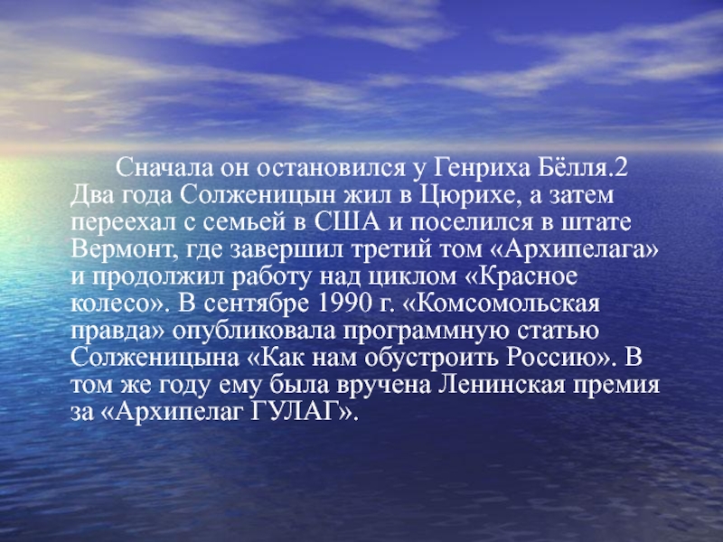 Цюрихе, а затем переехал с семьей в США и поселился в штате Вермонт, где завершил третий том «Архипелага» и продолжил работу над циклом «Красное колесо». В сентябре 1990 г. «Комсомольская правда» опубликовала программную статью Солженицына «Как нам обустроить Россию». В том же году ему была вручена Ленинская премия за «Архипелаг ГУЛАГ».