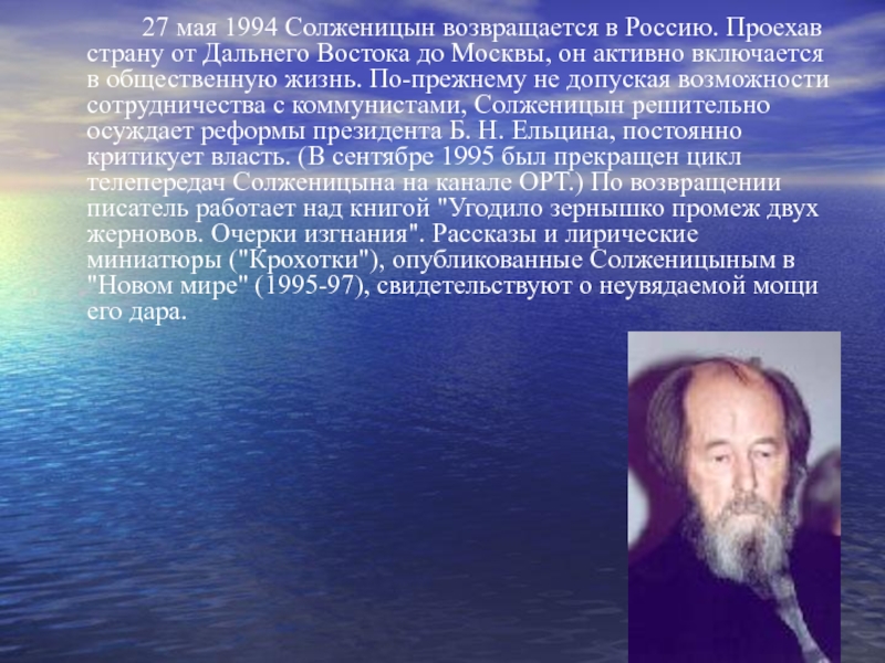 Востока до Москвы, он активно включается в общественную жизнь. По-прежнему не допуская возможности сотрудничества с коммунистами, Солженицын решительно осуждает реформы президента Б. Н. Ельцина, постоянно критикует власть. (В сентябре 1995 был прекращен цикл телепередач Солженицына на канале ОРТ.) По возвращении писатель работает над книгой "Угодило зернышко промеж двух жерновов. Очерки изгнания". Рассказы и лирические миниатюры ("Крохотки"), опубликованные Солженицыным в "Новом мире" (1995-97), свидетельствуют о неувядаемой мощи его дара.