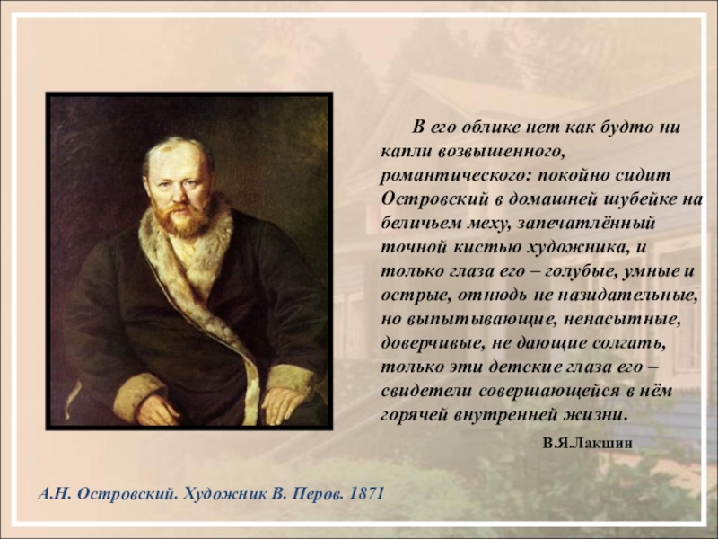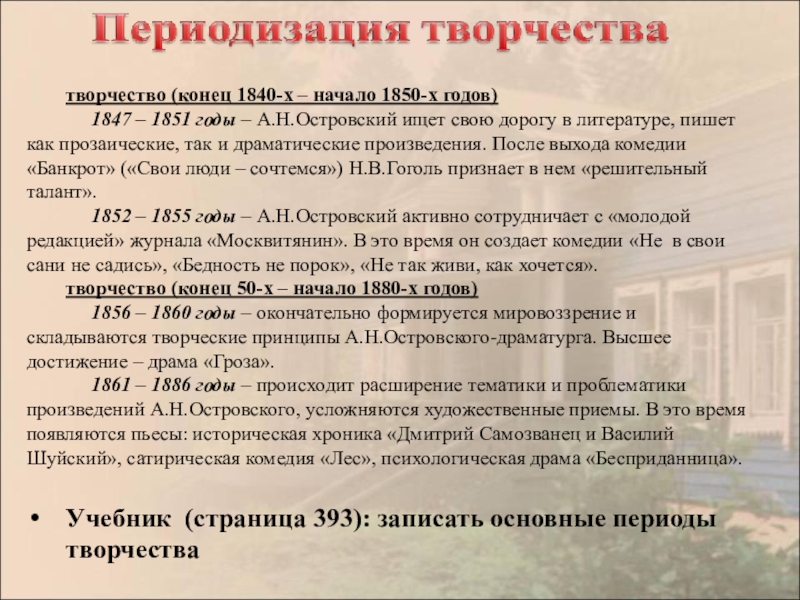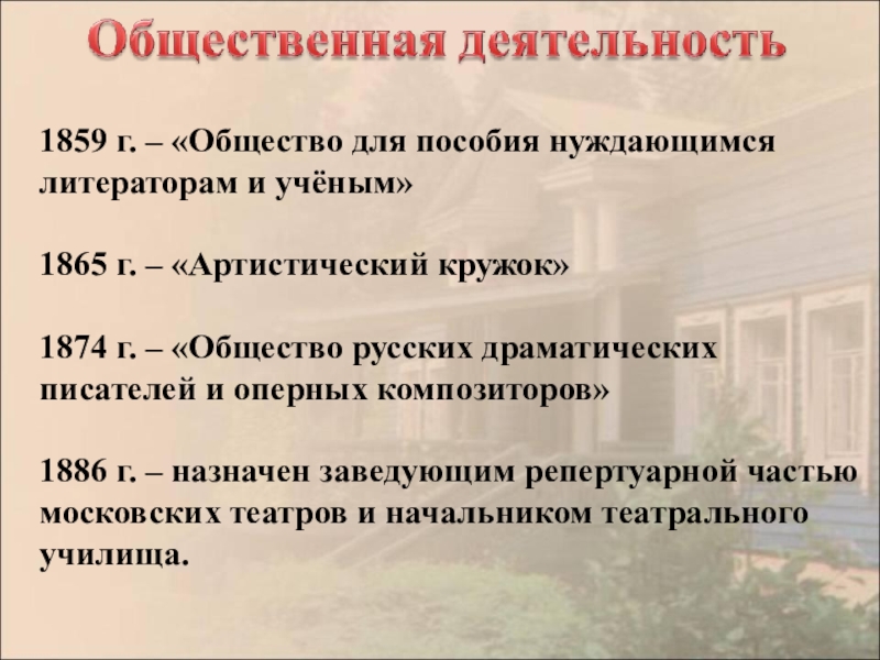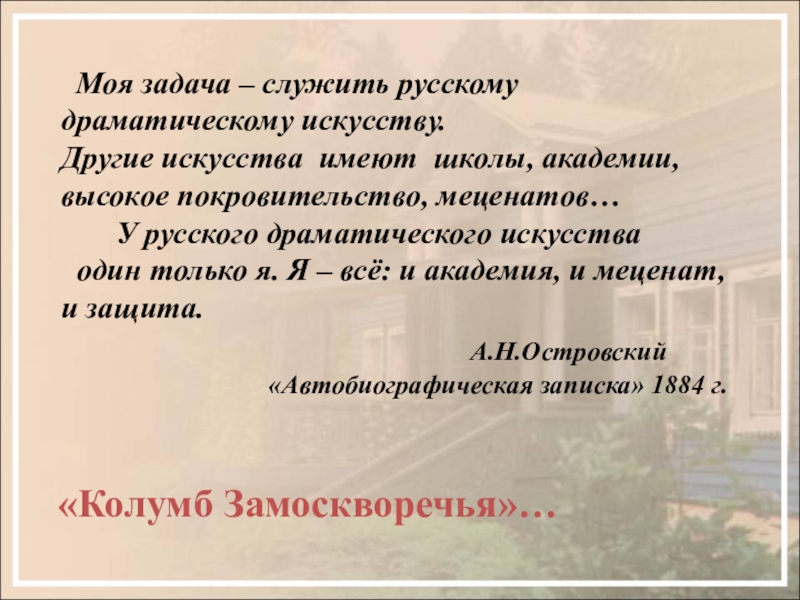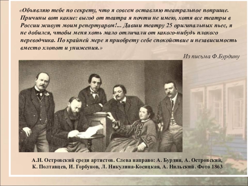 «Объявляю тебе по секрету, что я совсем оставляю театральное поприще. Причины вот какие: выгод от театра я почти не имею, хотя все театры в России живут моим репертуаром!... Давши театру 25 оригинальных пьес, я не добился, чтобы меня хоть мало отличали от какого-нибудь плохого переводчика. По крайней мере я приобрету себе спокойствие и независимость вместо хлопот и унижения.»