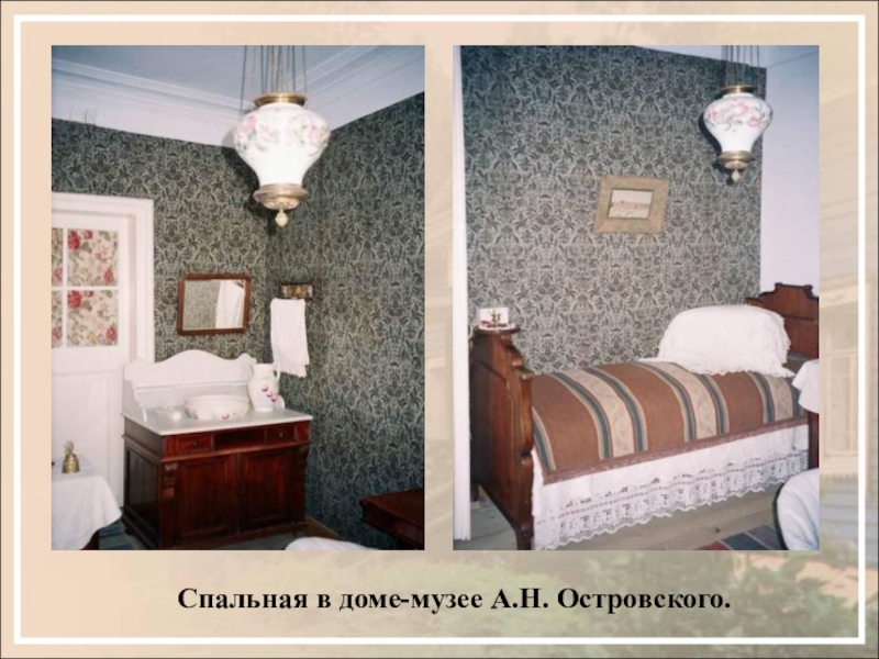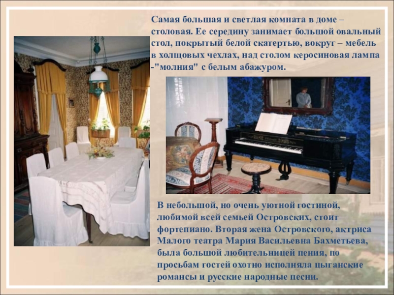 В небольшой, но очень уютной гостиной, любимой всей семьей Островских, стоит фортепиано. Вторая жена Островского, актриса Малого театра Мария Васильевна Бахметьева, была большой любительницей пения, по просьбам гостей охотно исполняла цыганские романсы и русские народные песни.