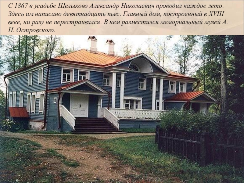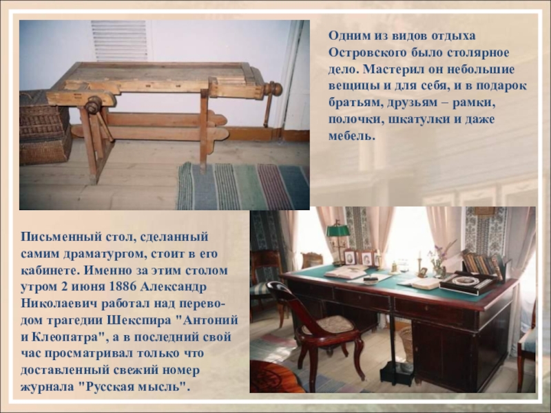 Письменный стол, сделанный самим драматургом, стоит в его кабинете. Именно за этим столом утром 2 июня 1886 Александр Николаевич работал над перево-дом трагедии Шекспира "Антоний и Клеопатра", а в последний свой час просматривал только что доставленный свежий номер журнала "Русская мысль".