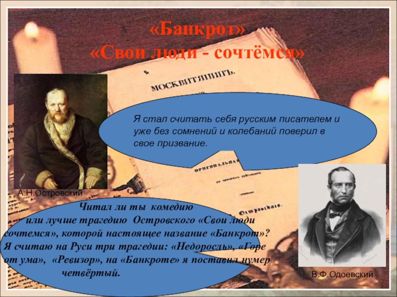 или лучше трагедию Островского «Свои люди сочтемся», которой настоящее название «Банкрот»? Я считаю на Руси три трагедии: «Недоросль», «Горе от ума», «Ревизор», на «Банкроте» я поставил нумер