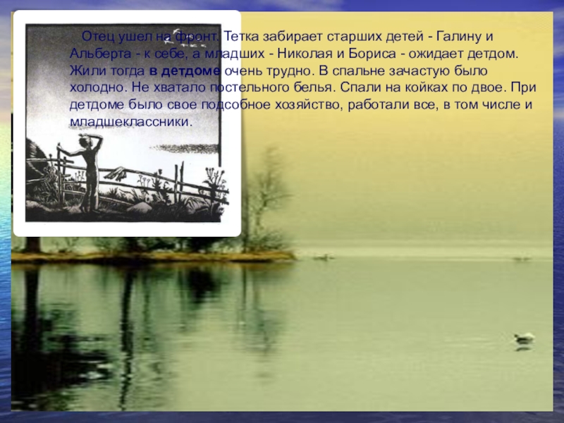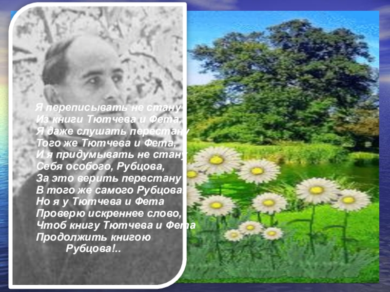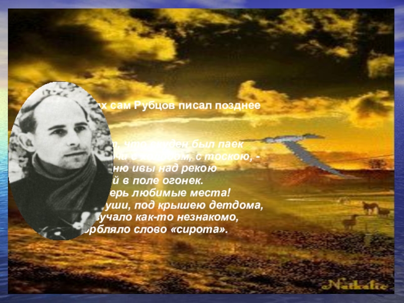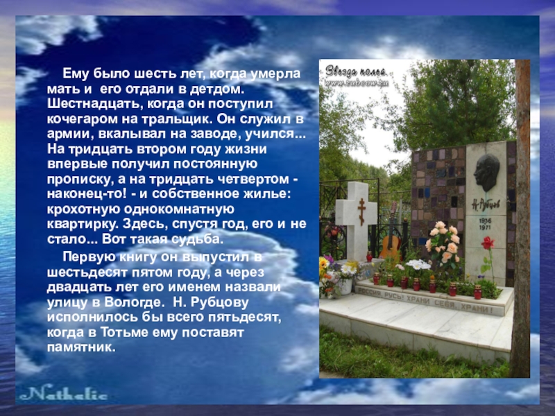 В 1946 г.Н. Рубцов закончил с похвальной грамотой 3 класс и начал писать стихи. Он в то время был хрупким мальчиком «с черными бездонными глазами и очень располагающей к себе улыбкой».
