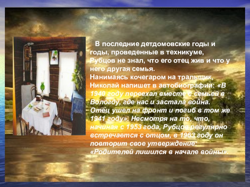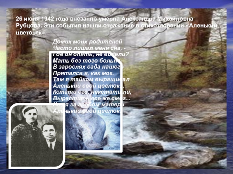 26 июня 1942 года внезапно умерла Александра Михайловна Рубцова. Эти события нашли отражение в стихотворении «Аленький цветочек».