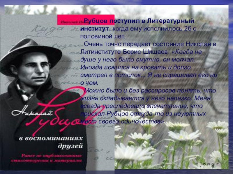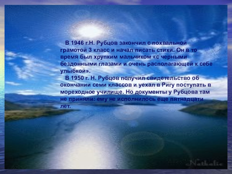 В 1950 г. Н. Рубцов получил свидетельство об окончании семи классов и уехал в Ригу поступать в мореходное училище. Но документы у Рубцова там не приняли: ему не исполнилось еще пятнадцати лет.