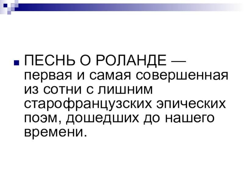 ПЕСНЬ О РОЛАНДЕ — первая и самая совершенная из сотни с лишним старофранцузских эпических поэм, дошедших до