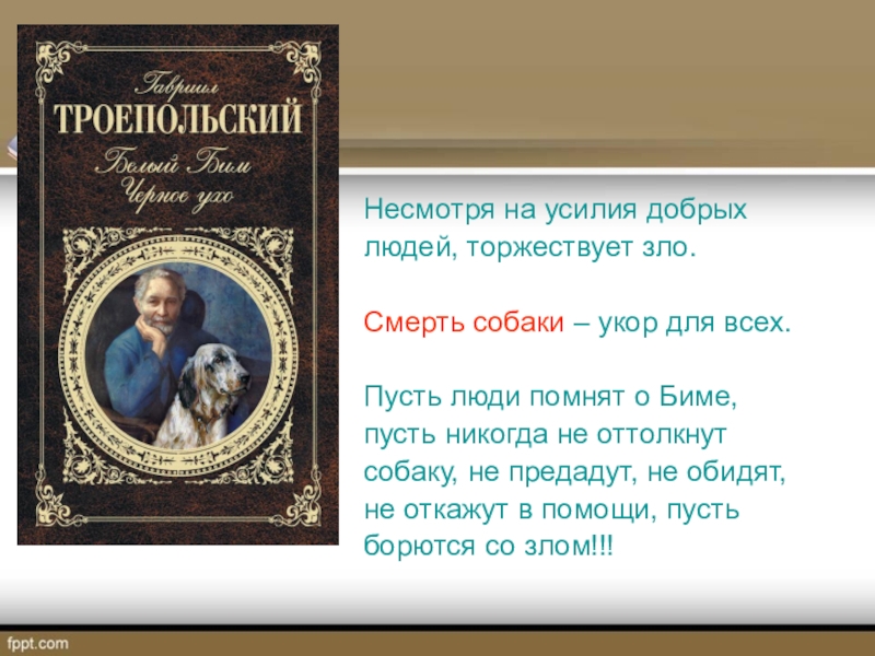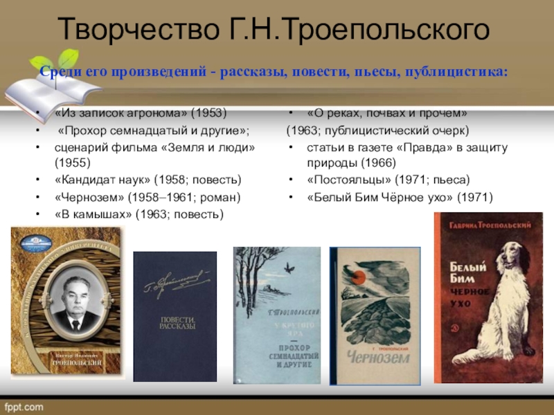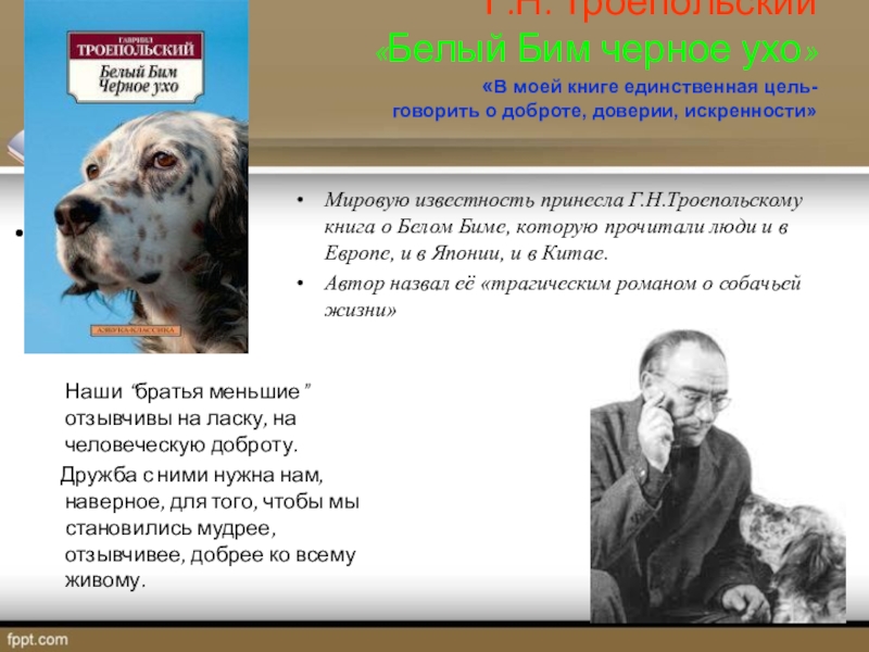 Мировую известность принесла Г.Н.Троепольскому книга о Белом Биме, которую прочитали люди и в Европе, и в Японии, и в Китае.