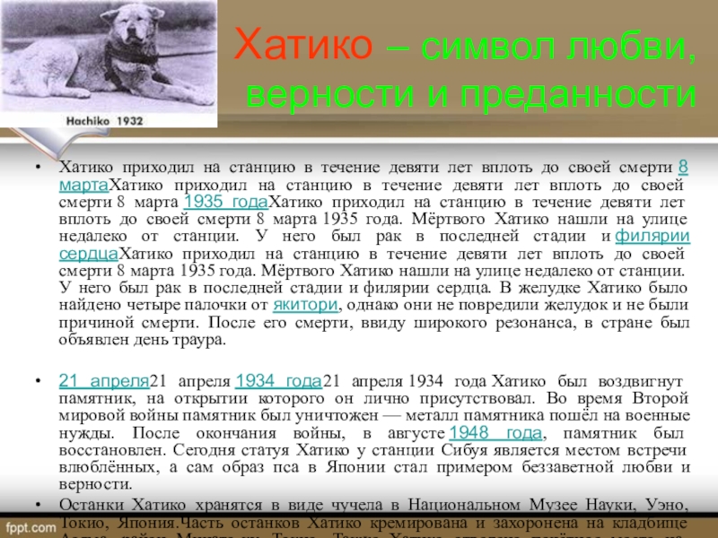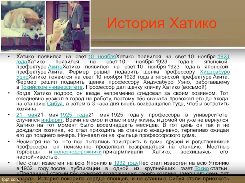 Хатико появился на свет 10 ноябряХатико появился на свет 10 ноября 1923 годаХатико появился на свет 10 ноября 1923 года в японской префектуре АкитаХатико появился на свет 10 ноября 1923 года в японской префектуре Акита. Фермер решил подарить щенка профессору Хидэсабуро УэноХатико появился на свет 10 ноября 1923 года в японской префектуре Акита. Фермер решил подарить щенка профессору Хидэсабуро Уэно, работавшему в Токийском университете. Профессор дал щенку кличку Хатико (восьмой).