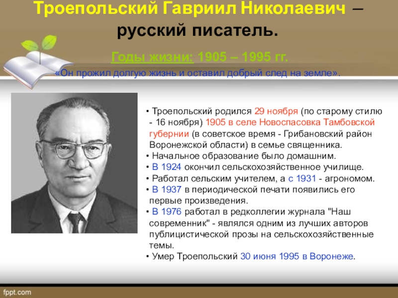 Умер Троепольский 30 июня 1995 в Воронеже.