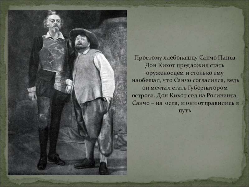 Слайд 8Простому хлебопашцу Санчо Панса Дон Кихот предложил стать оруженосцем и столько