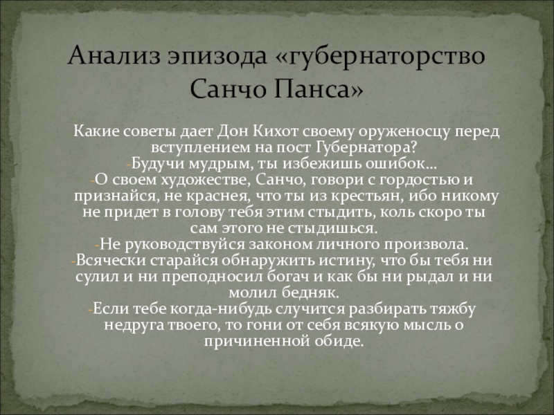Слайд 9Анализ эпизода «губернаторство Санчо Панса»