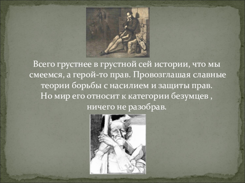 Слайд 5Дон Кихот казался сумасшедшим, когда дело касалось рыцарства, но в остальных