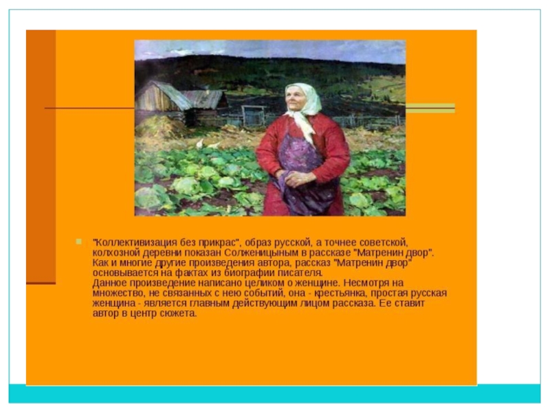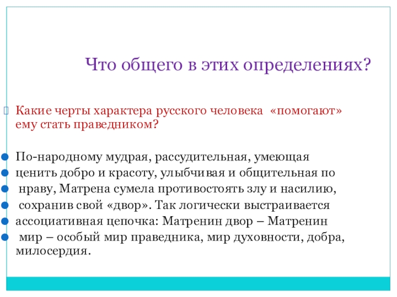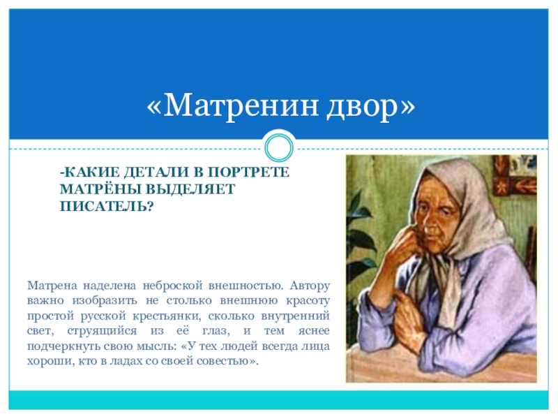 Она - сосредоточие лучших черт национального характера россиянки: стеснительна, понимает "образованность" рассказчика, уважает его за это, старается угодить постояльцу, варит ему в отдельном котелке картошку покрупнее, а сама ест мелкую. Автор ценит в Матрёне её деликатность, отсутствие досаждающего любопытства к жизни другого человека, трудолюбие.