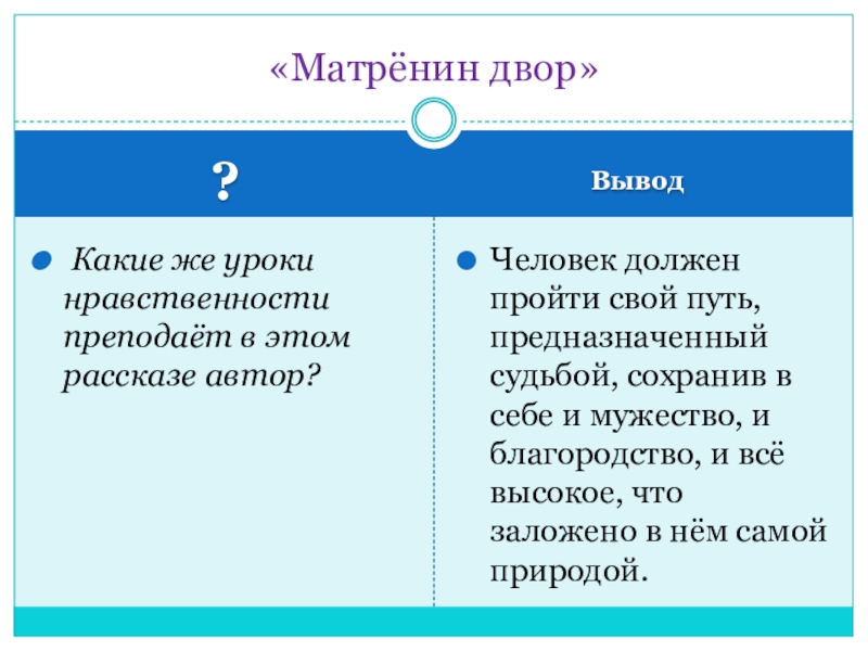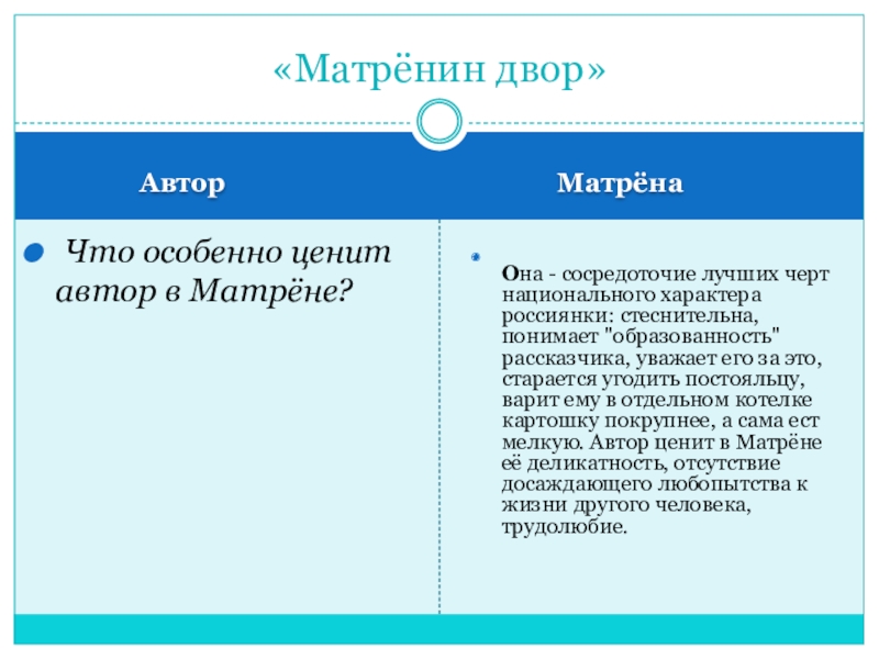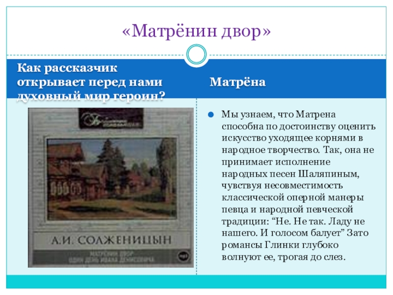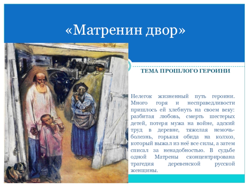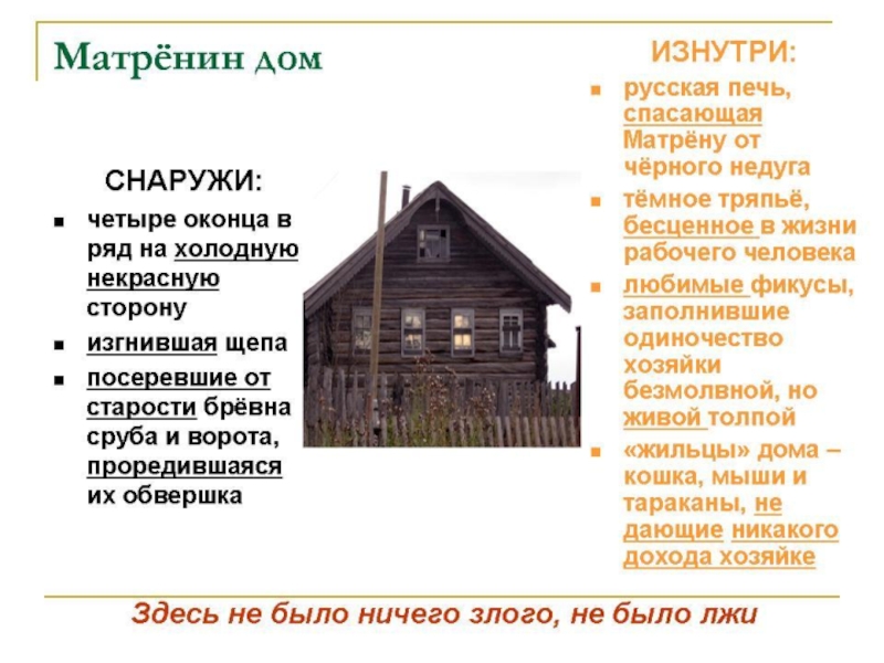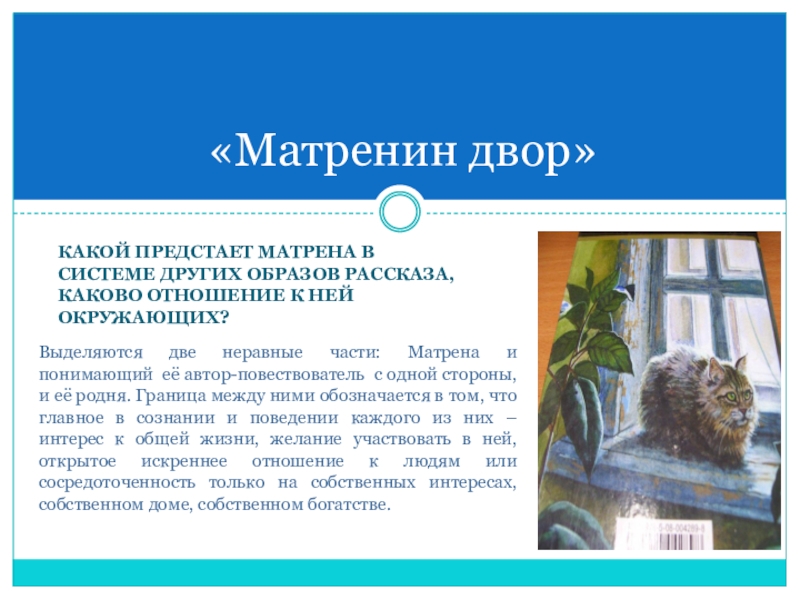 Выделяются две неравные части: Матрена и понимающий её автор-повествователь с одной стороны, и её родня. Граница между ними обозначается в том, что главное в сознании и поведении каждого из них – интерес к общей жизни, желание участвовать в ней, открытое искреннее отношение к людям или сосредоточенность только на собственных интересах, собственном доме, собственном богатстве.